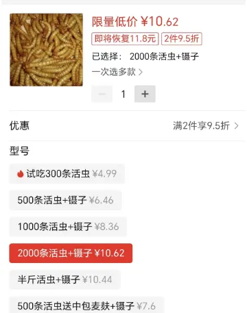 PDD上黄粉虫多是买来做宠物饲料的,价格在4-5元一斤,不过大多数卖家都是按条来卖,差不多2000条10块钱左右的价格。