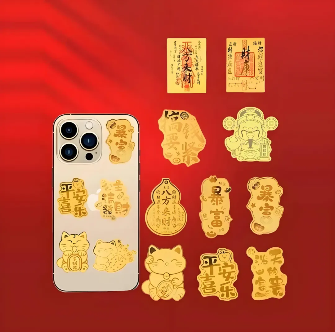于是就有人出了9块9的黄金贴纸。其实含金量极低,成本也只要几毛。但是贴在手机壳上美观又吉利。