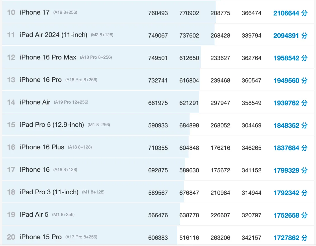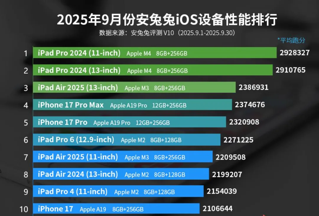 随着 iPhone 17 系列发布,iOS机型的性能排名也发生变动。目前,安兔兔公布了 9 月份的 iOS 设备性能榜。