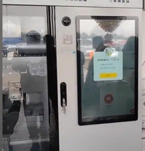 现在的无人面馆要比当年的高级了很多,首先机器由多部分组成,大屏的点餐屏幕,透明操作间,还有是出餐机器人三部分组成。