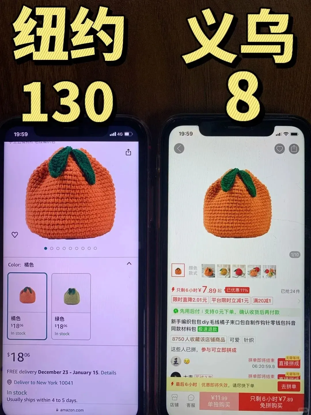 别小看它,平平无奇的针织袋,国内某多多平台售价7块多,我们转手卖18美刀。